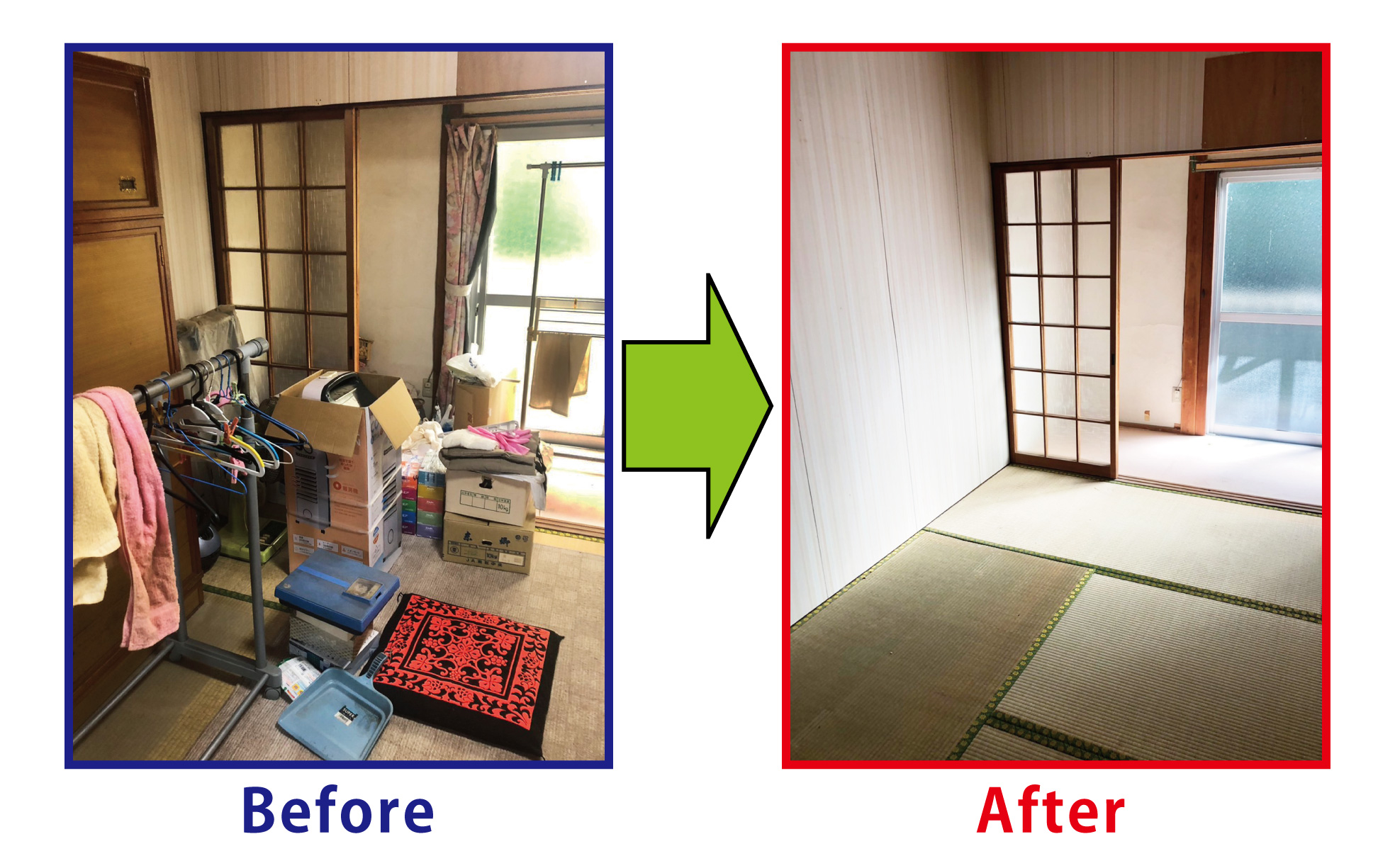 家財処分をさせていただきました。 和室に残された物を処分し 最終的にはスッキリと綺麗な状態になりました。 お見積りは、無料でさせていただきますので TEL : 0120-296-966まで お気軽にお問い合わせください。 お待ちしております。